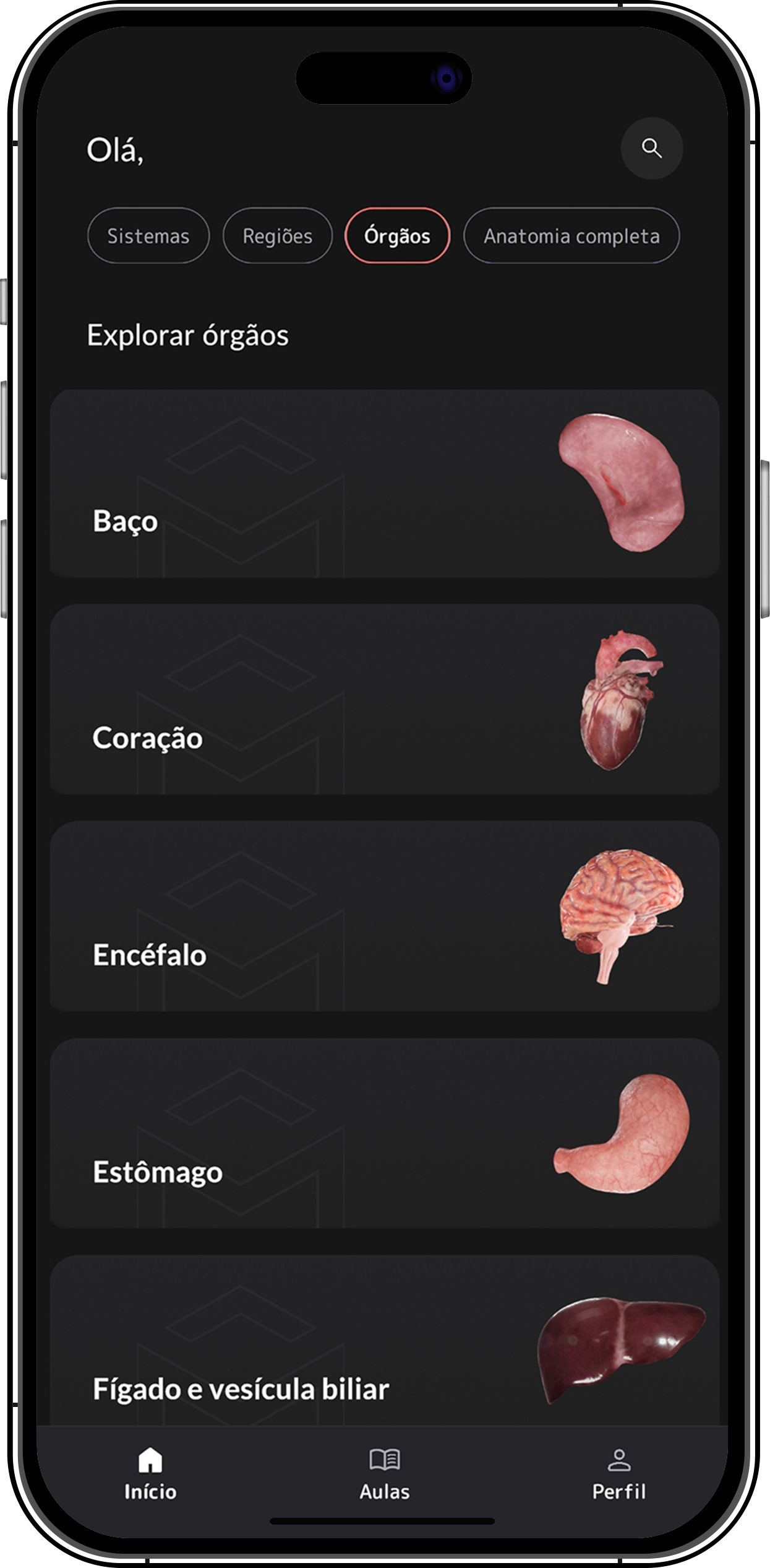Início: tela inicial com anatomia em 3D, para exploração e estudo.