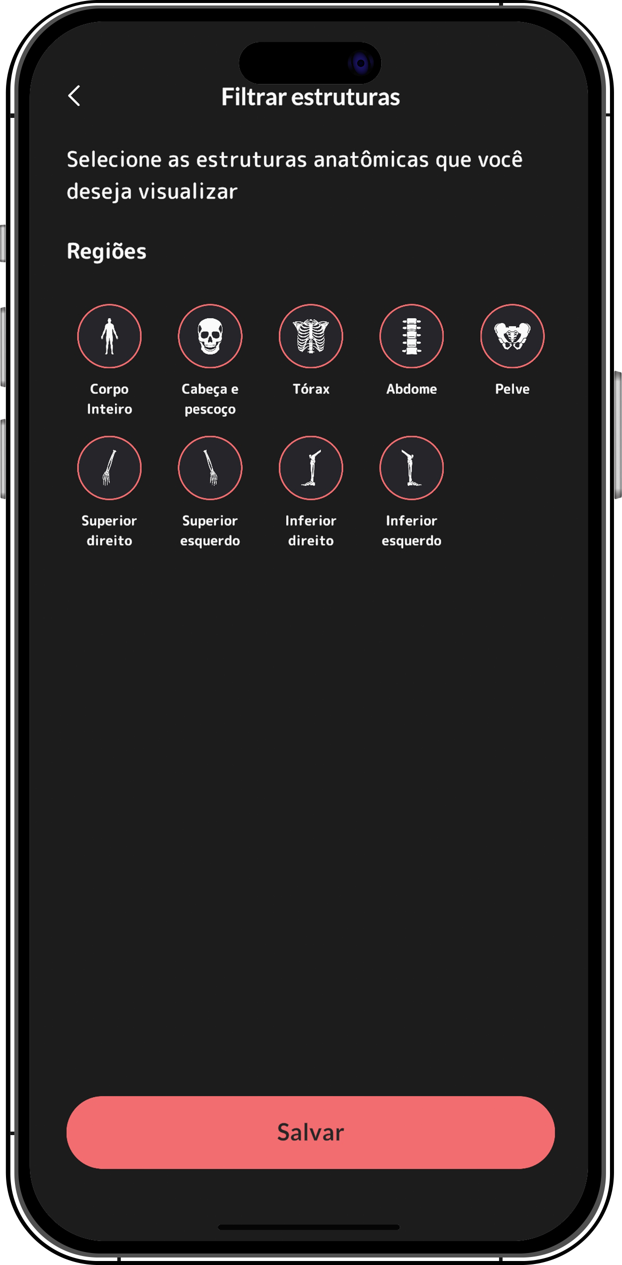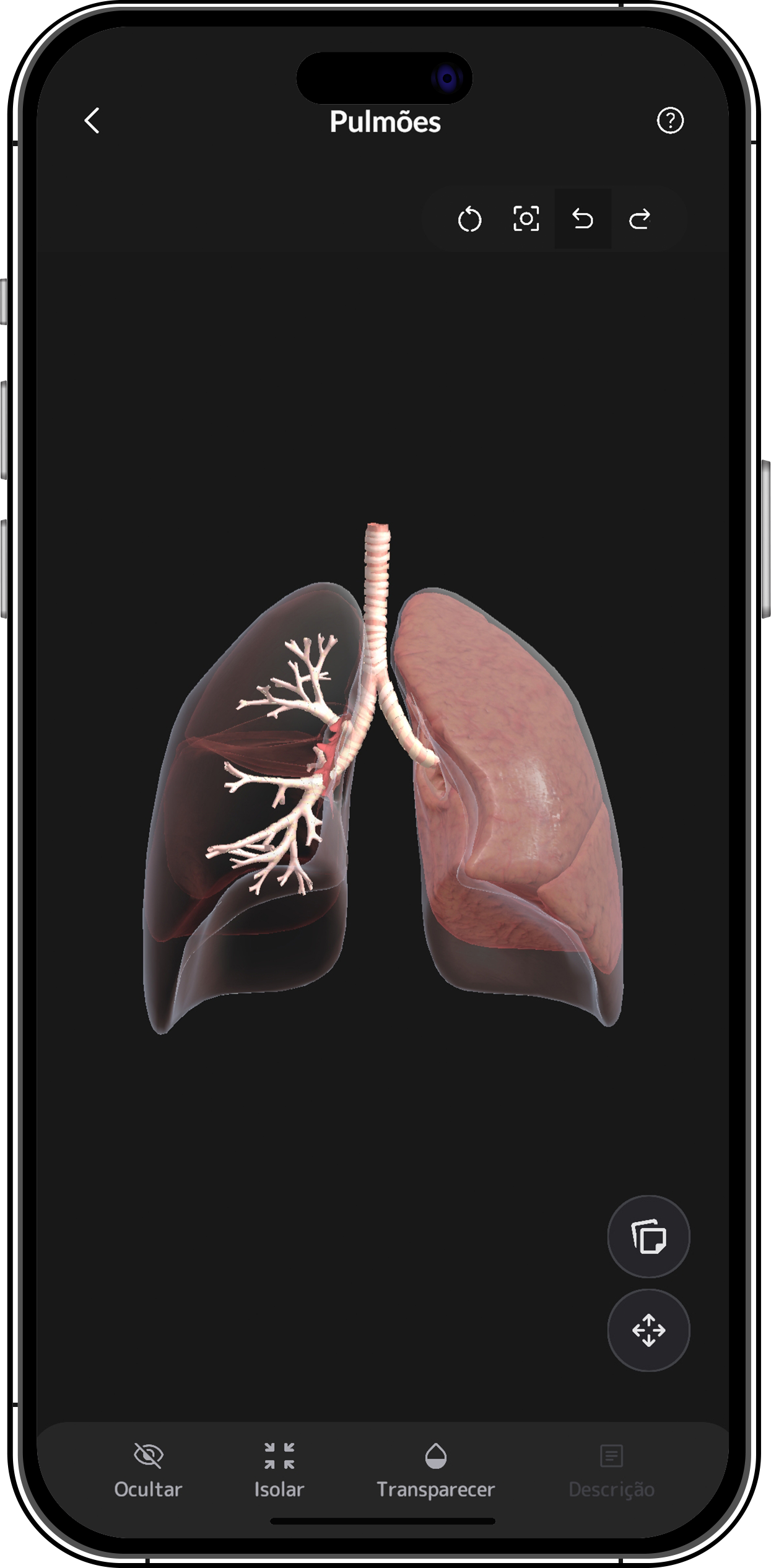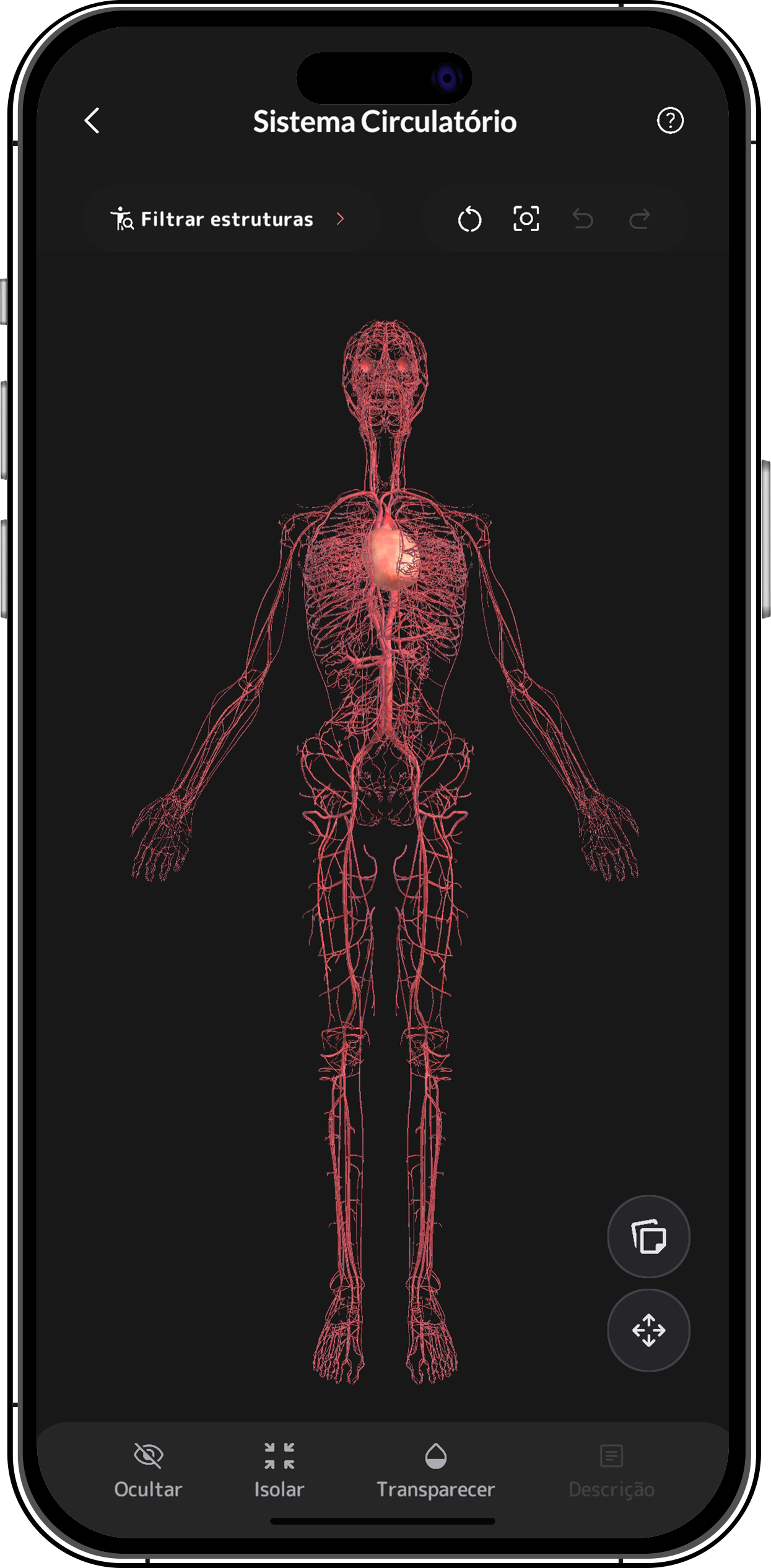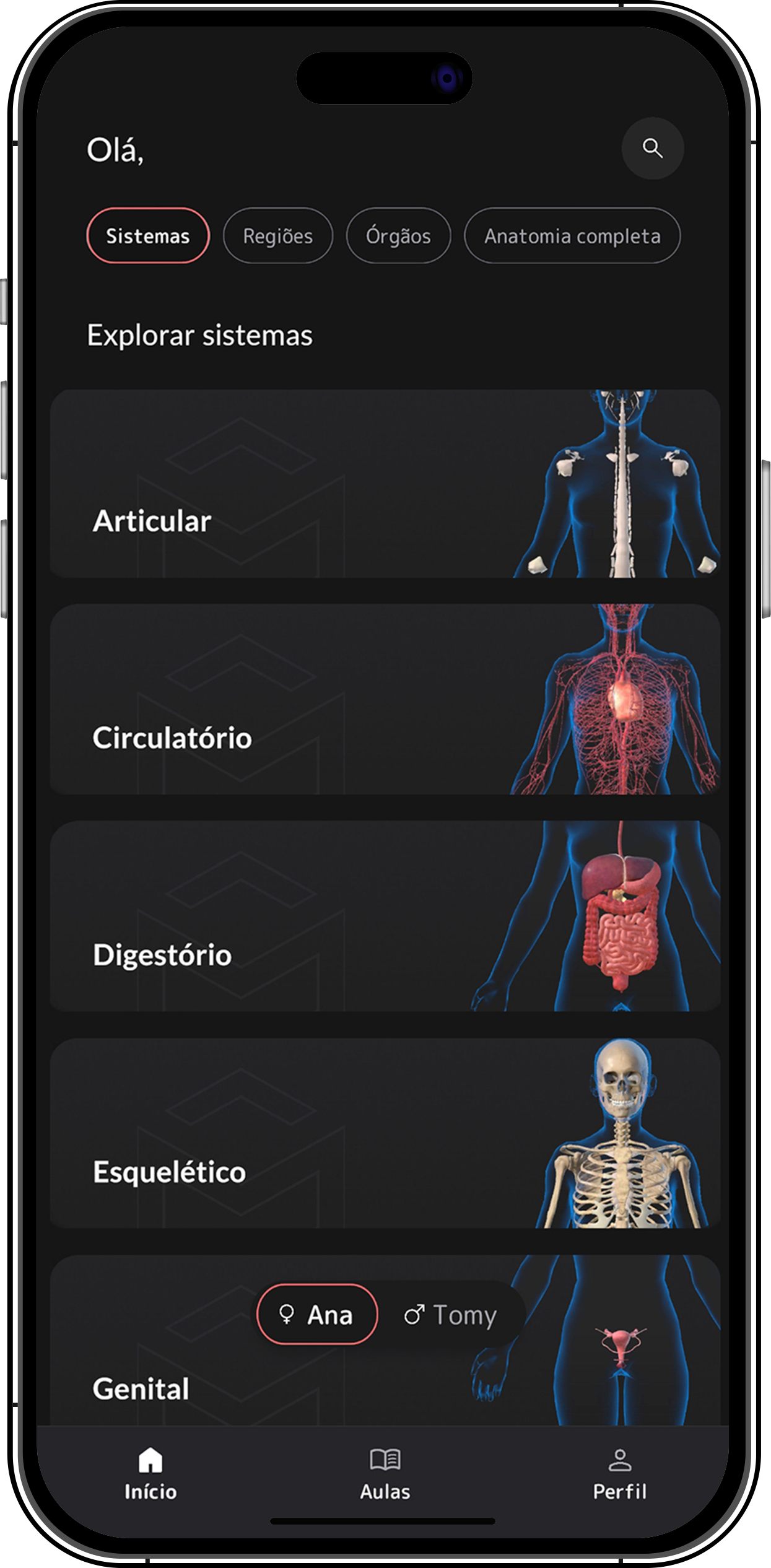 Ao acessar a tela de exploração da anatomia 3D, você pode escolher visualizar um sistema específico, uma região do corpo ou a anatomia completa. Também é possível interagir com o modelo 3D, ocultando, isolando ou deixando transparentes as estruturas de interesse.