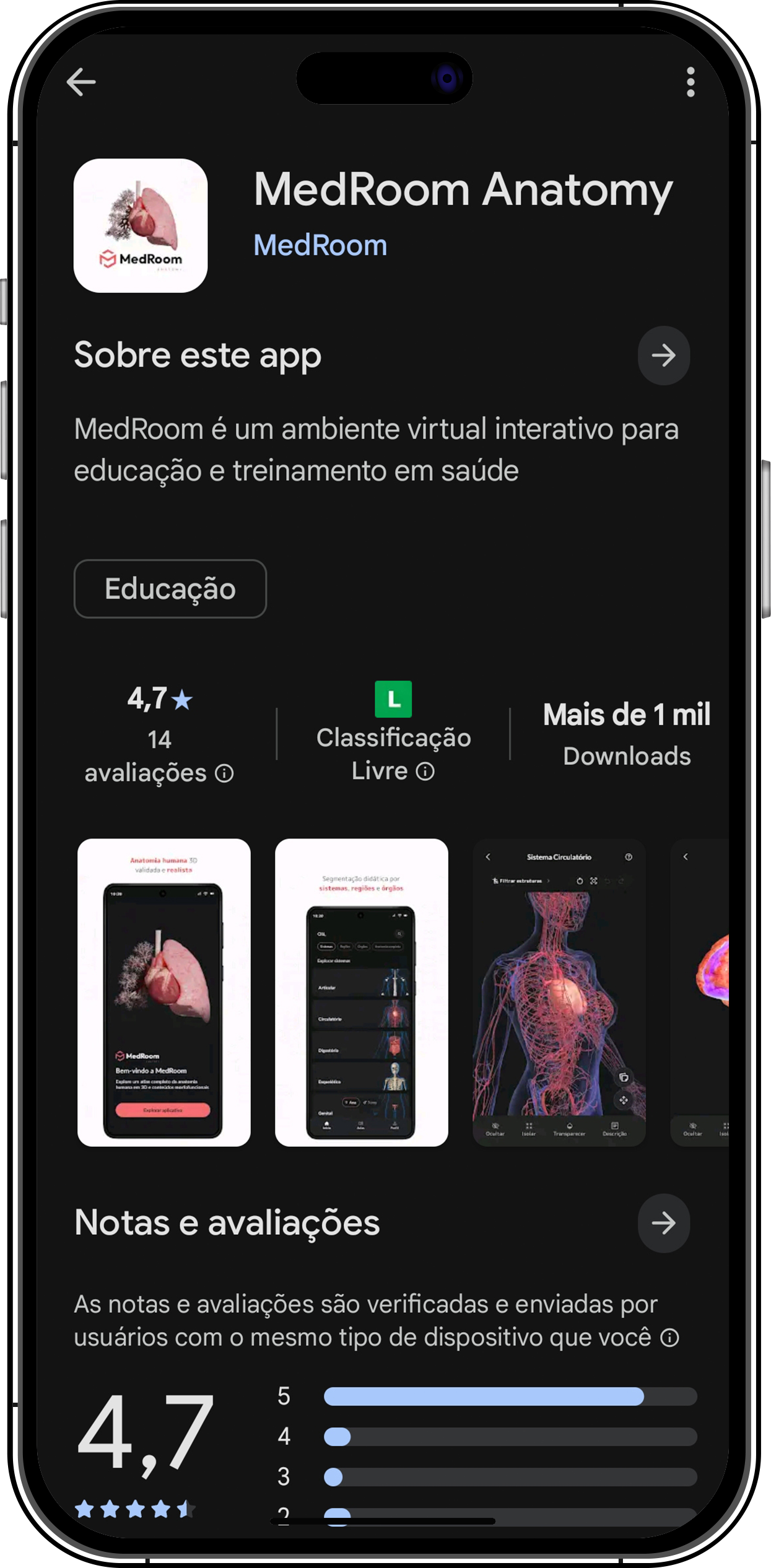 O MedRoom Anatomy agora está na palma da sua mão. Com o app, você pode explorar o corpo humano em 3D, masculino e feminino, direto no seu celular ou tablet, de um jeito fácil e intuitivo. Perfeito para estudar onde e quando quiser, além da sala de aula.